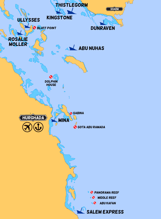 Alternamos los mejores pecios de todo el norte del Mar Rojo con las inmersiones más espectaculares, del estrecho de Gubal y Norte. Partiendo desde Hurghada nos dirigiremos al arrecife de Abu Nuhas donde en la ladera norte descansan los pecios Giannis D, Carnatic, Kimon M y Krisoula, un verdadero paraíso para los amantes de los pecios, en el estrecho de Gubal visitaremos el Ulysses, Kingstone y Dunraven, y nos adentraremos en la historia moderna buceando en los pecios hundidos durante la II Guerra Mundial SS Thistlegorm y Rosalie Moller. Navegamos hasta la zona de Safaga, para sumergirnos en el Salem Express, el ferry que se hundió en 1.991 con peregrinos que volvían de la Meca con consecuencias catastróficas. Hoy en día el buque se puede explorar casi al completo y es uno de los grandes pecios que esconde este mar.